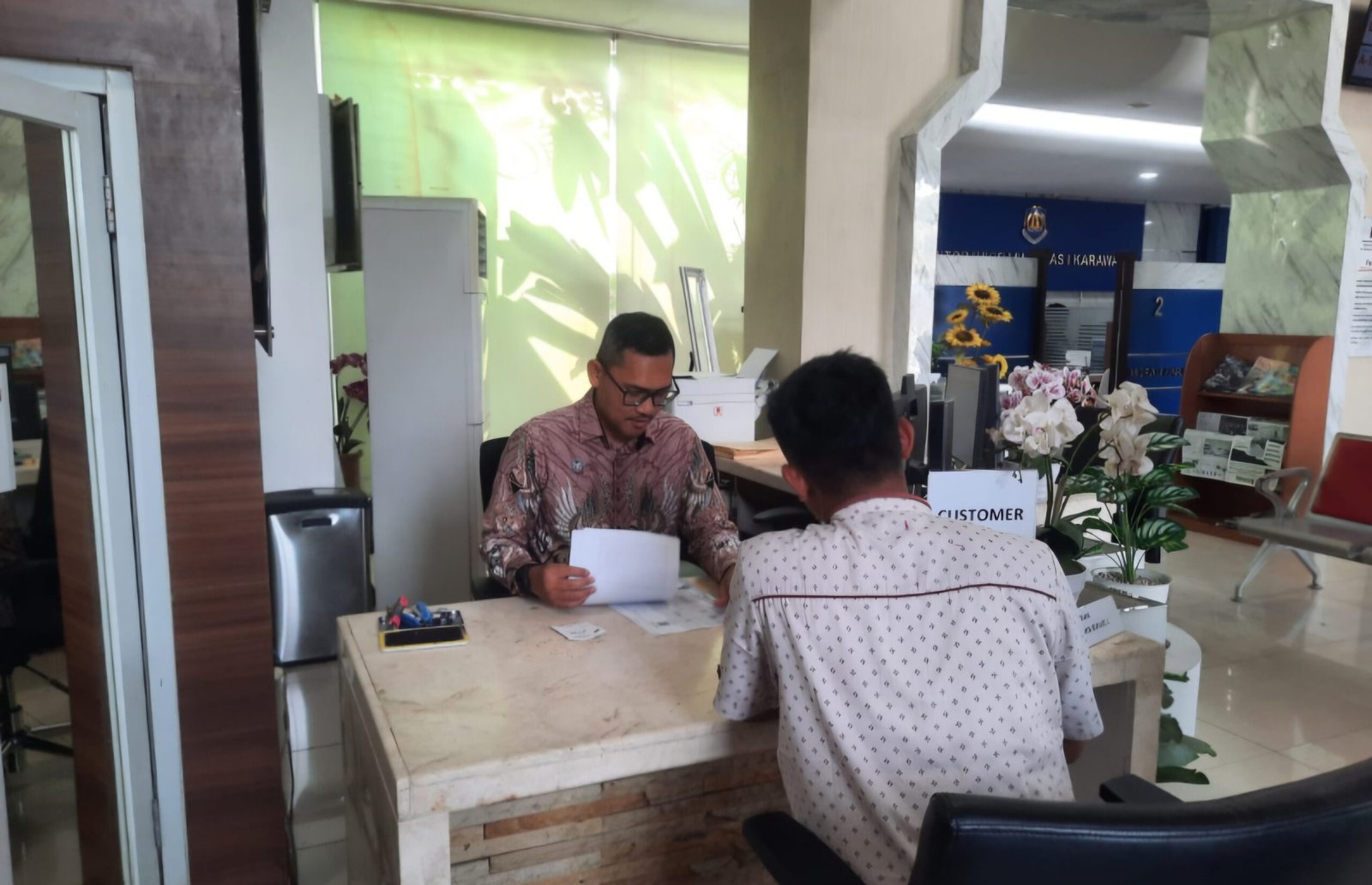 Selanjutnya, pemohon menuju ke ruang sebelah kanan ke customer service untuk pengecekan kelengkapan berkas. Setelah lengkap, langsung mengambil nomor antrean untuk menunggu sesi foto dan wawancara.